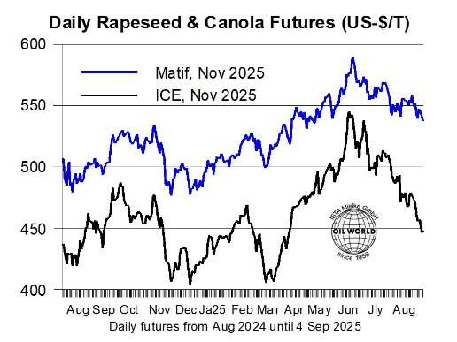 Auch politische Interventionen könnten die Handelsströme zwischen der EU und der Ukraine in dieser Saison verändern. Am 4. September trat eine Ausfuhrsteuer von 10 % auf Raps und Sojabohnen in Kraft, aber die tatsächlichen Auswirkungen auf das Exportvolumen werden wahrscheinlich begrenzt sein, da der Ausschluss "großer landwirtschaftlicher Holdings" ein Schlupfloch für landwirtschaftliche Betriebe schafft. Im Gegensatz dazu sind Berichten zufolge Landwirte und multinationale Unternehmen von der Exportsteuer betroffen, was die Vermarktung der diesjährigen ukrainischen Rapsernte (von der ein großer Teil noch unverkauft ist) erschwert.