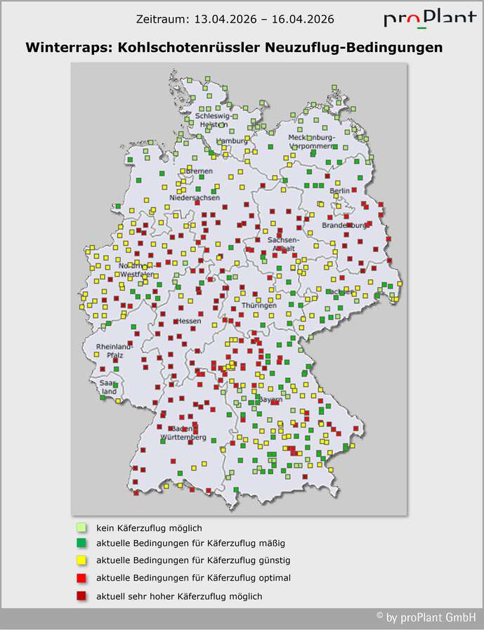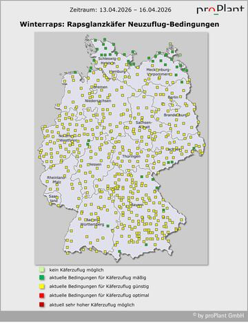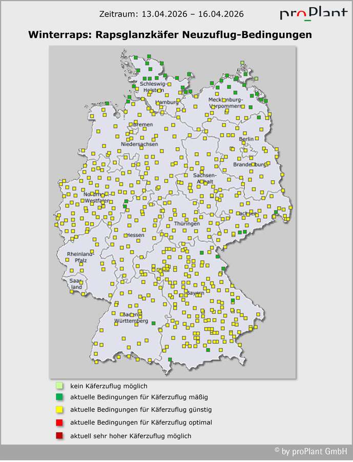 Deutschlandweit tritt der Rapsglanzkäfer stärker in Erscheinung als in den Vorjahren mit sehr geringem Befall. Der Befall in den Rapsknospen ist jedoch regional und schlagspezifisch sehr unterschiedlich. In weiten Teilen Süd- und Westdeutschlands dürfte der Zuflug der meisten Glanzkäfer bereits erfolgt sein. Mit Beginn der Rapsblüte verursachen die Käfer keinen Schaden mehr.
