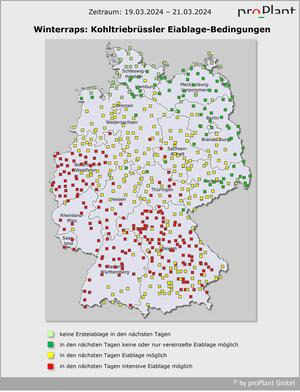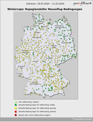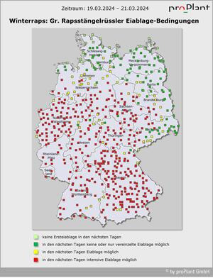 Bei frühlingshaften Temperaturen zwischen 14 und 19 Grad geht die Zuwanderung des Glanzkäfers diese Woche bis Freitag weiter, mit Ausnahme der etwas kühleren Regionen im Norden und Osten Deutschlands. Viele Rapsbestände sind schon im Knospenstadium. Vor der Rückkehr des angekündigten Spätwinters am Wochenende sollten die Bestände auf Befall kontrolliert werden: Pflanzen abklopfen. Die Gelbschale ist nicht aussagekräftig.