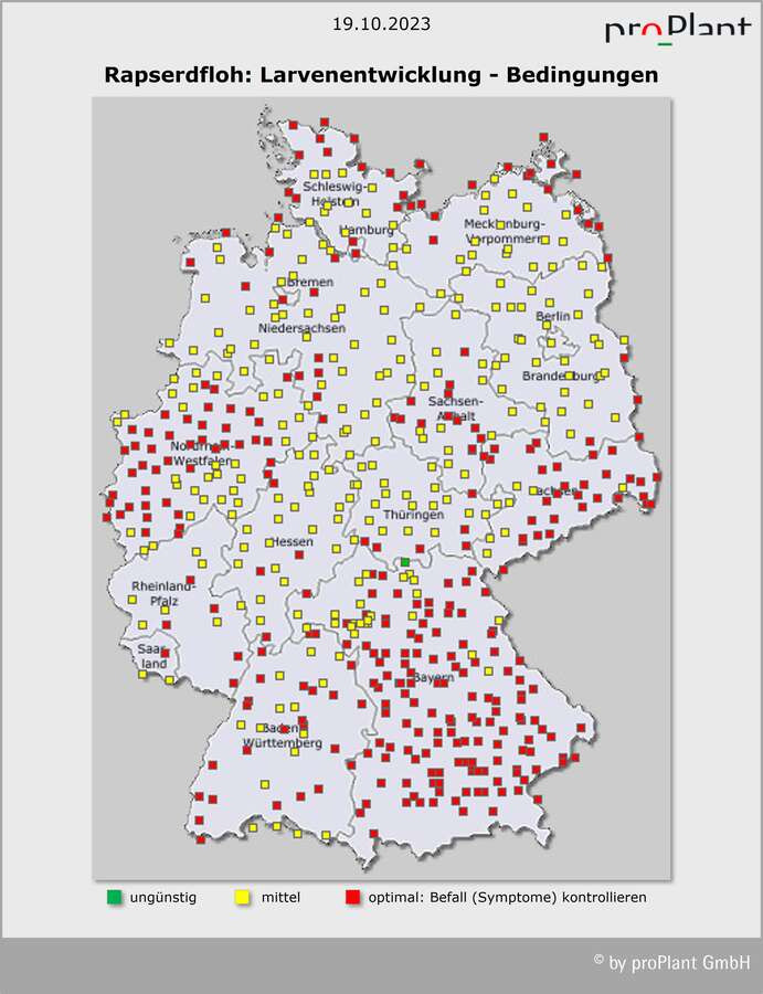 Wo es „nur“ um den Rapserdfloh geht: Kontrolle der Blattstiele auf Larvenbefall kontinuierlich weiter durchführen. Einstichstellen, Verbräunungen und Vernarbungen an der Innenseite der unteren Blattstiele sind Symptome der Larvenaktivität. Jetzt besteht noch ein enger Zusammenhang zwischen Anzahl der Symptome und Anzahl der Larven, d.h. man muss die Blattstiele nicht unbedingt aufschneiden. Auf Schlägen mit hohem Käferzuflug und starkem Blattfraß zeigt sich am Larvenbefall, wenn Behandlungen im September nicht gut gewirkt haben (Problem kurze Dauerwirkung bei hohen Temperaturen mit anhaltendem Erdfloh-Neuzuflug). Das Eiablagegeschäft der langlebigen Rapserdflöhe geht weiter (im aktuell viel kühleren Norden Deutschlands erst, wenn es wieder milder wird). Je nach Temperaturverlauf werden in den nächsten Wochen nach und nach weitere Larven schlüpfen.