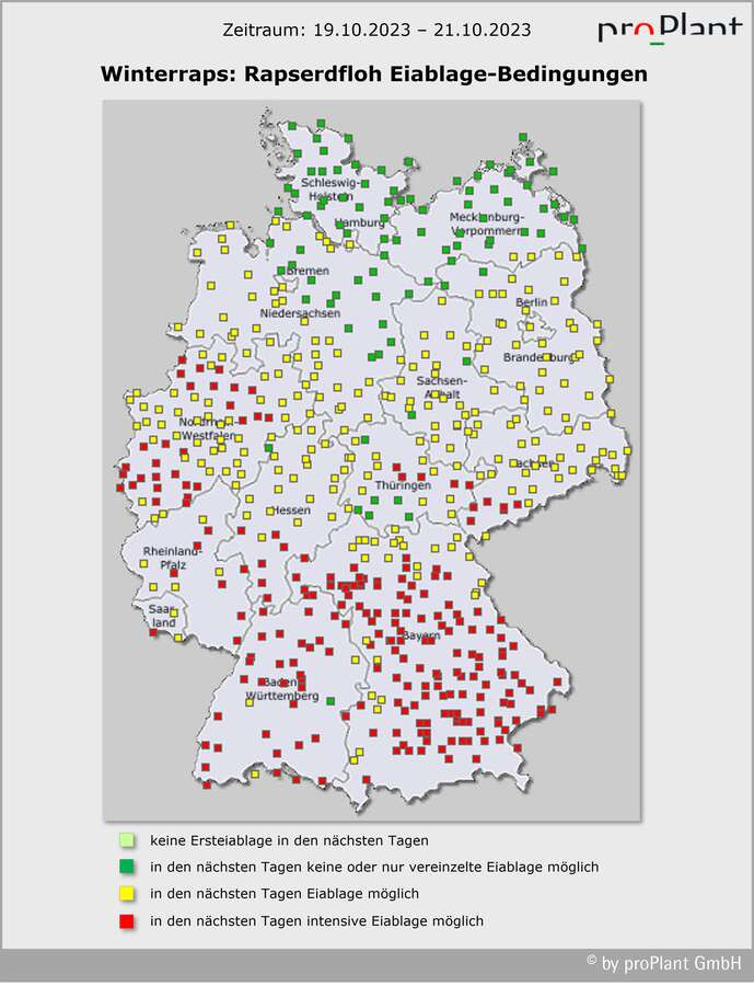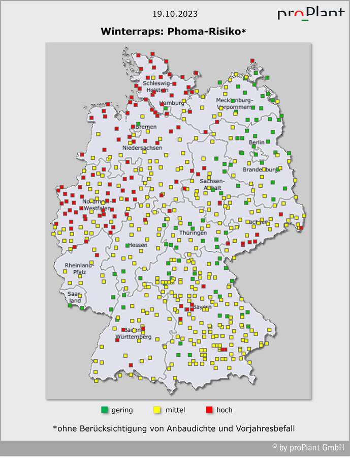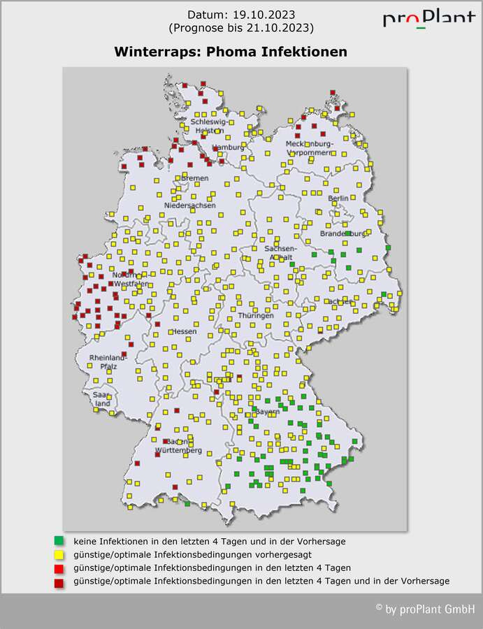 Eine ausstehende Wachstumsreglerbehandlung (insbesondere Nachkürzen sehr üppiger Rapsbestände) durchführen, sobald es die Bedingungen, v.a. nach gebietsweisen Nachtfrösten und Durchzug des stürmischen Wetters im Norden Deutschlands bei wieder milderer Witterung erlauben. Raps auf Phoma-Blattflecken kontrollieren. Die regnerische Phase ist für Phoma förderlich; das Befallsrisiko ist weiter gestiegen – v.a. in Schleswig-Holstein, im nordwestlichen Niedersachsen und Teilen von NRW. Ergiebige Regenfälle von vergangener Woche – besonders im Nordwesten Deutschlands – können im Laufe der kommenden Woche zu einem Anstieg des Phoma-Befalls führen. Bestände dann erneut kontrollieren. Direkt nach Niederschlägen ist eine Maßnahme bei vorhandenem Befall gut Phoma-wirksam (kurative bekämpfbare Infektionen).