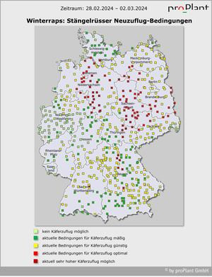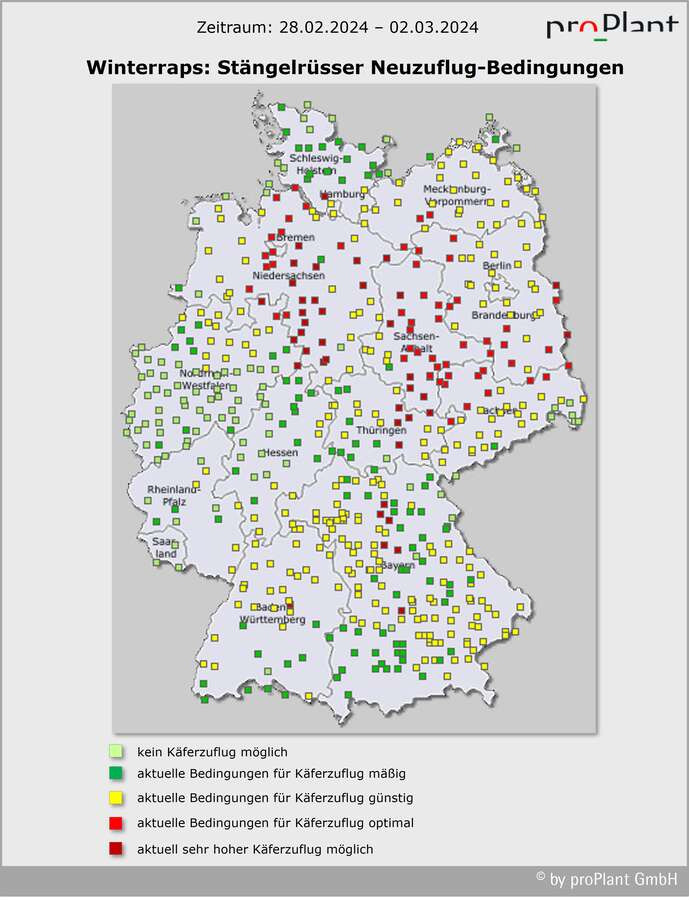 Wo schon bis 25. Februar die Schwelle beim Großen Rapsstängelrüssler in den Gelbschalen überschritten wurde oder sehr viele Gefleckte Kohltriebrüssler gefangen wurden, sollte in den nächsten Tagen behandelt und die Eiablage verhindert werden (sofern auf nassen Böden gefahren werden kann). Neuzuflug wird mitgetroffen. Da sich noch nicht vermehrte Glanzkäfer im Bestand aufhalten, sind die Pyrethroide des Typs II (z.B. Karate Zeon) zu bevorzugen.