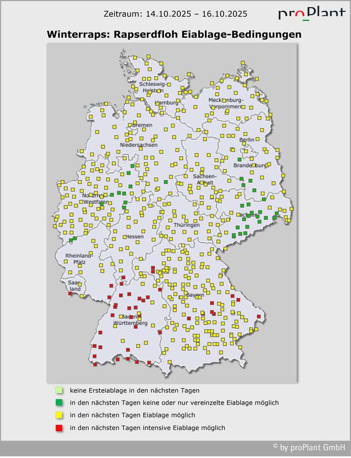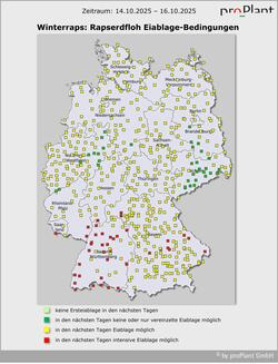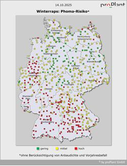 Meistens wird kein kritischer Phoma-Befall beobachtet. In Niedersachsen, Nordhessen und allen Regionen nördlich und östlich davon ist das Risiko für Blattbefall vom Wetter weiterhin gering bis mittel.