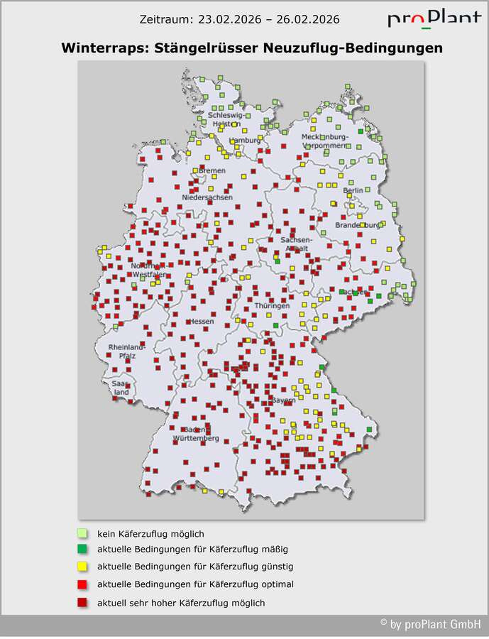 Gelbschalen im Winterraps aufstellen, falls noch nicht erfolgt: sauber und befüllt mit Wasser, etwas Spüli und einem Gitter. In dieser Woche wird verbreitet Zuflug der Stängelrüssler erwartet: Zur Wochenmitte wird es immer freundlicher. Die Sonne kommt länger zum Zuge. Am Rhein sind fast 20 Grad möglich. Sonst sind es meist 12 bis 16 Grad. In höheren Lagen, an den Küsten und im Nordosten Deutschlands bleibt es zu kühl für intensiveren Zuflug.