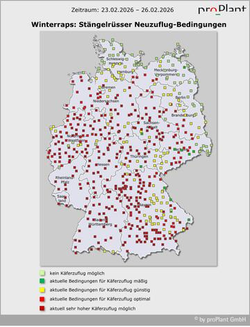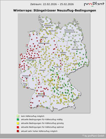 Wo in den wärmeren Regionen des Westens und Südwestens von Deutschland bereits Anfang Februar kritische Rüssler-Zahlen in Gelbschalen gezählt wurden, sollte die Behandlung in dieser Woche erfolgen, um die Eiablage dieser frühen Käfer zu verhindern und den Neuzuflug zu erfassen.