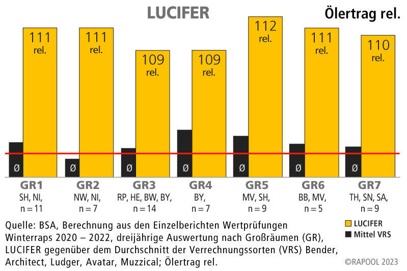 LUCIFER zeichnet sich als bemerkenswerter Kompensationstyp aus, der selbst unter extremen Stressbedingungen, wie starkem Blatt- oder Knospenverlust, außerordentlich gut kompensieren kann. Dies belegen Versuche mit künstlich induziertem Stress an verschiedenen Standorten. Diese Leistungsfähigkeit bewies LUCIFER auch im nassen, extrem widrigen Witterungsjahr 2023, insbesondere wenn die Gesundheit durch Fungizideinsatz unterstützt wurde. Die beeindruckenden Korn- und Ölerträge aus den Wertprüfungen konnte LUCIFER im BSV 2023 mit rel. 108 im Kornertrag bestätigen. In den LSV 2023 erreichte er mit rel. 102 (n = 16) ein solides Ergebnis. LUCIFER ist frohwüchsig im Herbst, hat eine gute Winterhärte und eine mittelfrühe Reife.